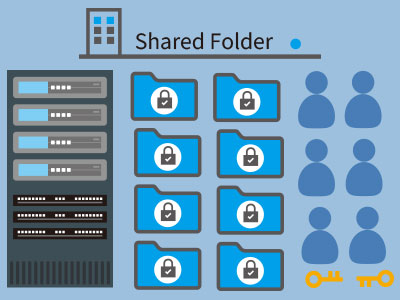 社内ネットワーク上の記憶領域内に共有フォルダは配置されます。利用者のIDは共有フォルダにアクセスする権限を与えられますが、メンバーによって閲覧・編集できるフォルダは異なります。