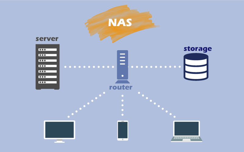 - ストレージデバイスとサーバをネットワークで接続するのがNAS方式です。導入が容易で、運用コストも安価に抑えられます。NAS方式で接続するストレージそのものを「NAS」と呼ぶ場合が多いようです。ファイル共有に特化した接続方式で、スケーラブルなストレージ管理が可能です。RAID構成を使用したNASでは、冗長性も高く、安全なバックアップも可能です。外出先からでもストレージ内のデータにアクセス・編集できる利便性や、そのデータを簡単に共有できることもNAS方式のメリットです。デメリットとしては、インターネットを使用するため、データの傍受・盗難などのリスクにさらされることがあげられます。 NASについての説明はこちら