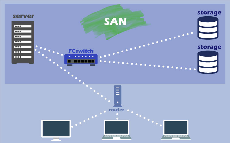 - DASの高速な処理とNASのストレージ共有の利便性を兼ね備えているのがSAN方式です。複数のファイバーチャネルデバイス間のデータをFCスイッチで制御し、高速かつ信頼性の高いデータ転送を実現します。ストレージシステムの中でも最も大容量のデータを扱う高いトランザクション処理に適した接続方式です。LANから独立したストレージ専用のネットワークを構築してストレージとサーバをFCで相互接続し、効率的な統合管理や運用を可能にします。ストレージが統合され、独自のストレージネットワークが構築されているため、頻繁にデータベースにアクセスするような大量のデータの読み書きや大容量のデータの取り合扱いにも適しています。SANは、以前であれば高速な光ファイバーケーブルを使用したFC-SANが一般的でしたが、FC-SAN以外にもEthernetやTCP/IP、iSCSIなどのIP(インターネットプロトコル)を利用して構築するIP-SANもあります。IP-SANは、インターネットで標準的に使われているTCP/IPでデータ転送を行うため、専用の機器は使いません。 SANについての説明はこちら