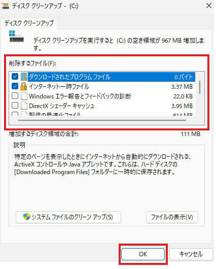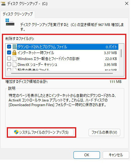 - ユーザーのファイルを対象にディスククリーンアップを行う