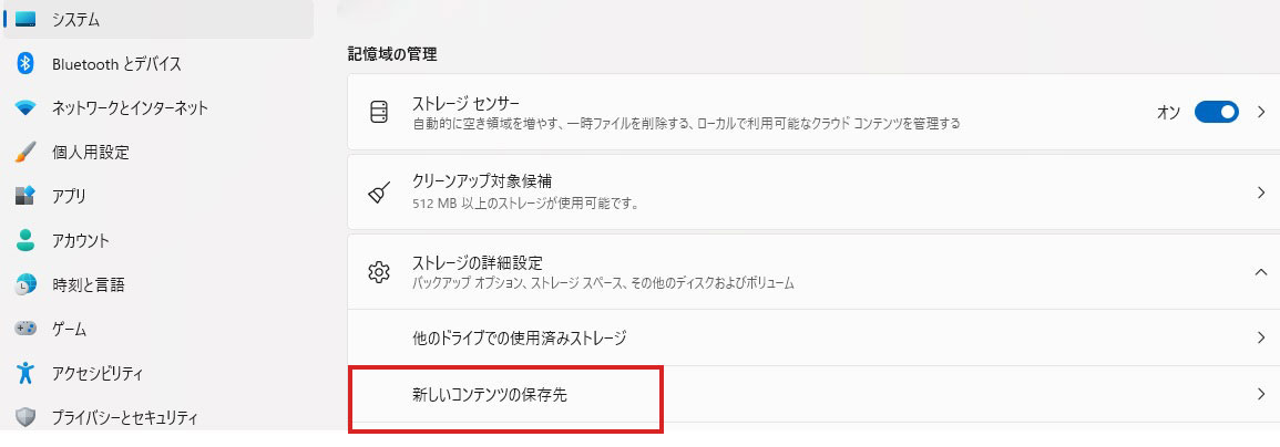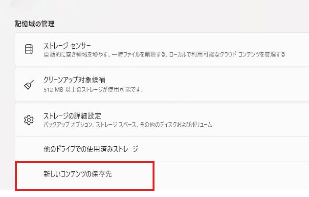- 5.ストレージの詳細設定の下向き矢印をクリックし、「新しいコンテンツの保存先」を選ぶ(図:1参照)