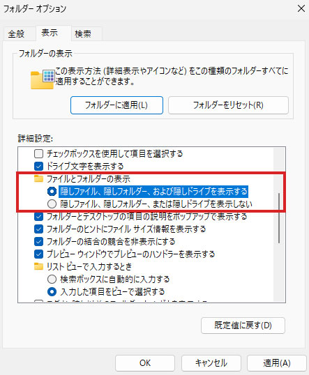 - 6.「表示」タブを選択し、詳細設定:のボックスの中の「隠しファイル、隠しフォルダー、及び隠しドライブを表示する」のラジオボタンをオンにします。(図:4参照)