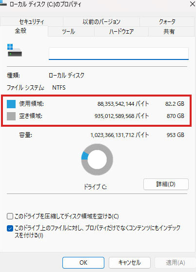 - 4. プロパティ画面を見ると、中ほどに使用領域と空き領域が数字と円グラフで表示されています。