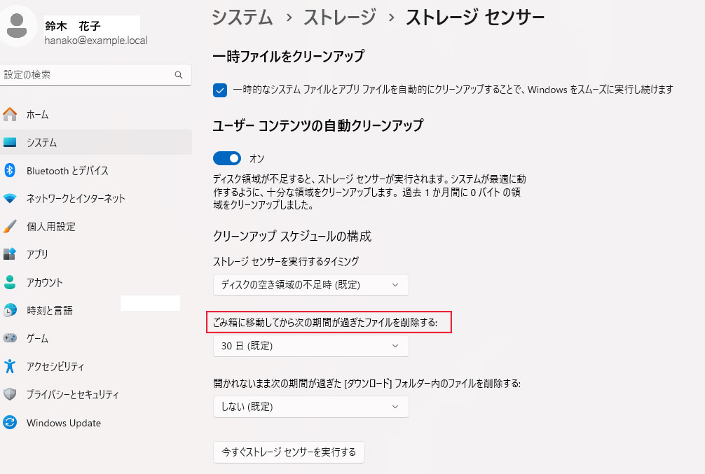ごみ箱内のファイルが定期的に自動削除される設定を変更したい場合は( 図1参照)、スタートメニューから設定に進み、システム→ストレージ→ストレージセンサーに進みます。「ユーザーコンテンツの自動クリーンアップ」のトグルボタンを「オン」にし、プルダウンからごみ箱の自動削除の間隔を変更します。ごみ箱の自動削除をしたくない場合は、「しない ( 規定 ) 」に変更します。( この設定がデフォルトです。)